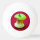 Foto de una gran manzana verde sobre fondo rojo. La manzana se come, sólo queda el núcleo.