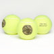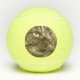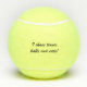 Pelota de tenis con la imagen del gato en el frente y las palabras "persigo gatos y pelotas de tenis" en la parte posterior.