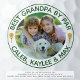 Cree un conjunto de fotos personalizadas de color personalizado de bolas de golf para un abuelo golfista con el título editable divertido BEST GRANDPA BY PAR y nombre(s) u otro texto personalizado mostrado en texto verde y borde circular contra un color de fondo blanco editable que puede cambiar a un color complementario de su imagen, su bolso de golf o su color favorito. Un regalo memorable de honor para el Día de los Abuelos, el Día del Padre o su cumpleaños. ASISTENCIA: Para obtener ayuda con la modificación o personalización del diseño, el cambio de color o la transferencia del diseño a otro producto, póngase en contacto con el diseñador ANTES DE PEDERLO a través de la pestaña MENSAJE de chat de Zazzle que aparece a continuación o envíe un correo electrónico a makeitaboutyoustore@gmail.com.