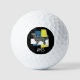 Cuadrícula de la silueta de perro Golden Retriever patrón abstracto amarillo y azul con fondo tricolor en un círculo negro. Personaliza tus tres iniciales en blanco bajo la forma de perro. Perfecto para el amante del perro en tu vida o el padre que ama el golf, estas pelotas de golf son la manera perfecta de mostrar tu pasión.