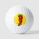 Caricatura de pimienta roja y caliente. Diseño original con fondo salpicado de pintura amarilla. Bolas de golf personalizados. Idea de regalo.