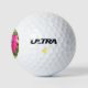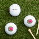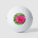 Una pelota de golf con una foto de una rosa rosa rosada y un fondo verde.