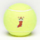 Estas pelotas de tenis tienen un gnomo barbudo en la parte superior de un Navidad rojo y blanco que se abastece entre dos bastones de caramelo y racimos de hojas huecas con bayas rojas.