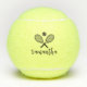 Bolas de tenis personalizadas impresas con un nombre o texto personalizado en una caligrafía clásica elegante de tipo femenino y de escritura femenina con doble tachón clásico de tenis y monograma de icono de pelota de tenis.