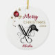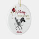 Salon Hairdresser Scissor Comb Secador de pelo adorno cerámico. Ornamento blanco y negro para el profesional del salón. Agradable y único. Incluye peine, tijeras y secador de pelo en negro. Mejorado con una bombilla roja de copo de nieve con cintas y estrellas de oro. Caligrafía del guión, Personalizar Feliz Navidad y el año junto con el nombre de la persona. Un regalo perfecto para el profesional del salón.