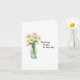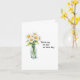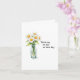 Esta sincera tarjeta de bienvenida "get well" incluye un hermoso ilustracion acuarela de un frasco de vidrio transparente lleno de cinco delicadas mareas blancas, cada una con un vibrante centro amarillo y frondosos tallos y hojas verdes. El diseño es encantador y está situado a la izquierda de la tarjeta, lo que crea una sensación de equilibrio y tranquilidad. La simplicidad de la imagen se complementa con el elegante tipo de letra negro de la derecha, que dice "Pensando en ti en este día". Con un fondo blanco y simple, la tarjeta exuda un sentido de paz y positividad, lo que la convierte en la manera perfecta de enviar buenos deseos a un ser querido en un momento difícil. 🌼 🌿