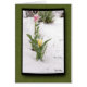 Dos tulipanes rosados y amarillos florecientes de primavera salpicados por un día de duchas de nieve. Esta fotografía enmarcada en negro se coloca sobre fondo verde texturado. Personalice el campo de plantilla para el saludo interno, mantenga el saludo actual, quite el texto que deja espacio para una nota manuscrita o haga clic en personalizar para seleccionar un estilo de fuente, tamaño y color que prefiera.