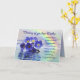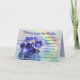 Hermoso olvido azul arrojado a la deriva en un lago con un arco iris detrás. Un bello versículo completa perfectamente esta tarjeta única.