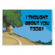 Un gráfico personalizado de un chica sentado bajo un árbol en una colina con las palabras que pensé sobre ti hoy. El interior dice que fue tan agradable que lo haré mañana.