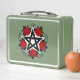 Pentagrama negro con estampado, decorado con rosas rojas florecientes con hojas sobre fondo blanco. Estilo tatuaje.
