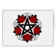 Pentagrama negro con estampado, decorado con rosas rojas florecientes con hojas sobre fondo blanco. Estilo tatuaje.