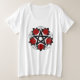 Pentagrama negro con estampado, decorado con rosas rojas florecientes con hojas sobre fondo blanco. Estilo tatuaje.