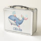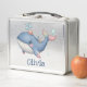 Esta metalizado caja de almuerzo personalizada cuenta con una ballena hermosa y caprichosa en un vibrante esquema de color rosa y azul nadando alegremente con un pequeño gorra.