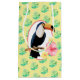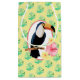 Este diseño alegre tiene un tema tropical con un patrón de fondo de hojas verdes. En el centro hay un tocan con flores amarillas y rojas. Puede personalizar del color de fondo.