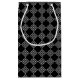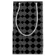 Esta bolsa de regalo de papel se muestra en una impresión de diamantes negros. Personalizar esta bolsa o compra como está.
