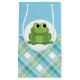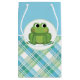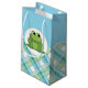 Una adorable bolsa de regalo de rana, diseñada exclusivamente por Artistically Invited, con una rana linda con un oval blanco delineado en verde por delante y por detrás, sobre un fondo que envuelve alrededor de la bolsa con azul en la parte superior y un patrón de yeso azul y verde en la parte inferior. Esta es la bolsa de regalo perfecta para regalar regalos a los que aman las ranas, o para bolsas de favores para sus invitados en su coordina ducha de ranas azules y de mantas verdes o celebración de fiestas.