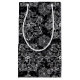 Este bolso de regalo de vacaciones para Navidades se muestra en un diseño impreso de copos de nieve en blanco y negro. Personalizar este artículo o compra tal cual. Imagen de archivo freepik.com all-free-download.com