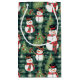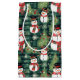 Este bolso de regalo de vacaciones para Navidades se muestra en un impreso festivo de muñecos de nieve. Snowman Green Plaid de tamaño pequeño mostrado