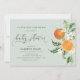 pequeña invitación a la ducha de bebé y naranjas de cítricos de color verde acuático. El texto y los colores se pueden personalizar.