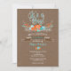 Pequeña Invitación de Pumpkin Baby Shower para Boy con colores agua, marrón y naranja. El fondo es un efecto burlap marrón oscuro.