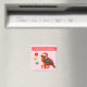Navidades, pequeño pájaro en un imán rosa. Este pájaro villancico está parado en una caja de regalo cerca de tres bolas de Navidad. ¡Disfruta la temporada de Navidades! El texto se puede personalizar.