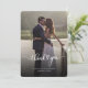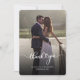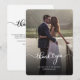 Una manera grandiosa y reflexiva de agradecer a tus amigos, familia y compañeros de trabajo que te honraron su presencia en tu día de boda con esta moderna foto gracias a las cartas con la mano de guion con "gracias" y un corazón de amor.