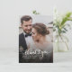 Una manera grandiosa y reflexiva de agradecer a tus amigos, familia y compañeros de trabajo que aparecieron para apoyarte en tu día de boda con esta moderna foto gracias a las tarjetas con la mano de guion con "gracias" y un corazón de amor.
