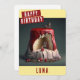 Una linda tarjeta de cumpleaños con una torta de cumpleaños con la temática de la Caperucita Roja en la parte delantera con "Feliz Cumpleaños", letra en negrita con todas las mayúsculas. Personalice la parte delantera agregando su(s) nombre(s). El interior de la tarjeta incluye espacio para el mensaje escrito a mano o con tipeo.