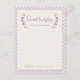 Creada para coordinarse con la colección de anuncios de nacimiento "Dulce Floral", esta linda tarjeta "Deseos para el bebé" presenta la frase "Dulces deseos para el bebé (Nombre)" enmarcada por una corona de delicadas flores y hojas. También hay espacio en la parte inferior para el nombre del amigo o familiar. El diseño y el texto están colocados sobre un patrón de gingham morado dibujado a mano. Esta tarjeta es perfecta para baby showers, así como para despedidas de soltera y bodas. Otras ideas de frases incluyen: "Dulces deseos para la futura novia", "Dulces deseos para la feliz pareja", o "Ideas de citas para los recién casados".
