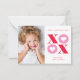Esta tarjeta de el día de San Valentín horizontal para aula fotográfica de Stacey Meacham presenta grandes mezclas alternantes de tipo xoxo rojo y rosa con corazones sobre fondo blanco. La parte posterior de la tarjeta tiene un color rojo coincidente que se puede quitar o escribir para agregar un mensaje personal a los amigos. Es atrevido y gráfico. Perfecto para el cliente moderno y experto.
