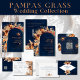 Impresionante, moderna tarjeta de recinto de boda con pampas elementos de boho de hierba en la gruesa terracota, tonos rústicos con fondo azul marino. Agregue la dirección URL de su sitio web de bodas al reverso de la tarjeta y el código QR se actualizará, o elimine si no es necesario. Personalice con sus propios detalles utilizando las plantillas de texto.