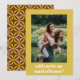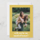 Haz la pregunta a tu criada de honor con estilo con esta moderna tarjeta de fotos retro. Con un alegre marco amarillo, una foto de personalizable y un audaz patrón geométrico en la parte de atrás, esta tarjeta es perfecta para pedirle a su mejor amigo que se quede de lado en su gran día. Personalízalo con tu foto favorita y un mensaje sincero para hacer el momento más especial.