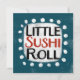 Un lindo diseño de comida tipográfica que dice "Little Sushi Roll". Es texto en negro y rojo sobre un rectángulo blanco con puntos blancos divertidos y juguetones rodeándolo, todo sobre un fondo verde azulado.