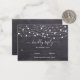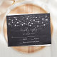 Invite a sus amigos y familiares a su boda con estas baratas invitaciones rústicas a bodas en pizarra y tarjetas rsvp. Estas tarjetas RSVP de boda incluyen pizarra de pizarra gris rústica con elegantes luces de cuerda. DERECHOS RESERVADOS © 2020 Judy Burrows, Black Dog Art - Todos los derechos reservados. Tarjeta RSVP de Boda de Encendido Presupuestario