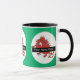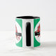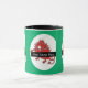 Un Ringer Mug verde y blanco con el labio y la manecilla negros y tres tiernos dragones rojos sujetando un lugar para añadir el nombre del propietario.