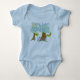 Little Bluebird camisetas de primer cumpleaños, palos para el cuerpo, tarjetas, bolsas de tote, botones y más presenta dos árboles altos con un pequeño pájaro mozo en una rama, flores y texto que dice "¡Hoy soy UNO!".