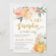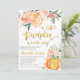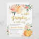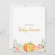 La invitación incluye una calabaza naranja con flores rosas y naranjas. Este diseño es perfecto para una ducha con motivos de otoño.