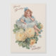 Bonito pequeño chica victoriano con sash azul y sinuoso frito blanco sentado entre rosas amarillas con texto de bienvenida de San Valentín.