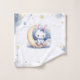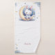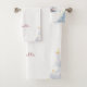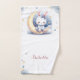 Un juego de toallas de baño súper lindo con un lindo conejito blanco con un hermoso arco violeta sentado en una hermosa luna con algunas estrellas doradas cayendo y algunas polvorientas nubes azules.