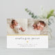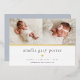 El dulce y elegante anuncio de nacimiento presenta dos fotos de recién nacidos alineadas una al lado de la otra, con una banda de Relieve metalizado dorado debajo. Personaliza con el nombre del bebé, las estadísticas de nacimiento y un mensaje familiar, adornado con un pequeño corazón de Relieve metalizado dorado.