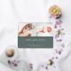 El dulce y elegante anuncio de nacimiento presenta dos fotos de recién nacidos alineadas una al lado de la otra, con una banda de Relieve metalizado dorado debajo. Personaliza con el nombre del bebé, las estadísticas de nacimiento y un mensaje familiar, adornado con un pequeño corazón de Relieve metalizado dorado sobre un fondo verde forestal.