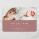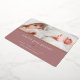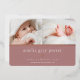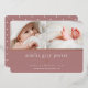 El dulce y elegante anuncio de nacimiento presenta dos fotos de recién nacidos alineadas una al lado de la otra, con una banda de Relieve metalizado de oro rosa debajo. Personaliza con el nombre del bebé, estadísticas de nacimiento y un mensaje familiar, adornado con un pequeño corazón de Relieve metalizado de oro rosa sobre un polvoriento fondo malva rosa.