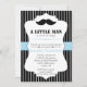 Esta preciosa invitación a una ducha de bebé es una forma maravillosa de invitar a sus invitados a unirse a usted para celebrar su nueva llegada. Este diseño tiene un fondo de pinstripe en blanco y negro con una entrada de blanco y una banda azul en el centro. En la parte superior hay un gráfico negro de un bigote. Los detalles de su fiesta se centran más abajo y son completamente personalizables. Sólo tienes que añadir los detalles de la ducha y ya estás listo para ir.