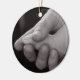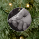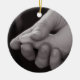 Ornamento con una fotografía en blanco y negro de un pie diminuto en una mano grande.