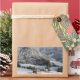 Pegatina rectangular del pequeño pueblo alpino Sankt Magdalena, o Santa Maddalena con iglesia, algunos chalés y hoteles en el medio del bosque del valle Val di Funes (Villnoesstal) en la nieve en invierno, Tirol del Sur, Italia.
