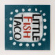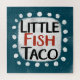 Un lindo diseño de comida tipográfica que dice "Little Fish Taco". Es texto en negro y rojo sobre un rectángulo blanco con puntos blancos divertidos y juguetones rodeándolo, todo sobre un fondo verde azulado.