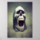 Un cráneo con ojos rojos está buscando el resto de su cuerpo. Este es un arte generado por IA.