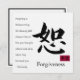 Con el personaje chino en busca de perdón, el mensaje en esta tarjeta de ropa de cama nos recuerda lo importante que es el perdón para nuestra paz mental. La parte trasera es blanca con un borde negro. Consulte la etiqueta de favor y el pegatina coincidentes. Ver toda la colección de la Tarjeta de Ilustración en INVITES | Sección Invitaciones y Tarjetas.