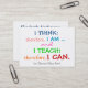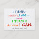 Creo que el sentimiento es claro, sí... :) Los que piensan de otra manera nunca han enseñado. Esto también está disponible con espacio para la personalización de mis otros posters y productos para profesores. Cita original de los artículos de los profesores de Sharon Rhea Ford. Artículos originales de los profesores (con copyright) de Sharon Rhea Ford ... Derechos reservados: todos los derechos reservados registrados: Sat feb 07 14:31:50 UTC 2009 Huella digital:Mostrar huella digital e3860c4f5cfa933c3ebf98f88f81c327b9377 000b9da37b2ee0a333851d36eddb Título:Enseñanza Descripción de la cotización:Creo que, por lo tanto, lo soy, y enseño; por lo tanto, puedo. MCN:C9E78-CCFC0-4E856 Como profesores, somos profesionales. Tener una tarjeta de visita lista para entregar a los padres. Dé tu número de teléfono escolar y dirección de correo electrónico de la escuela. Añade necesidades básicas o instrucciones si lo deseas. Puede utilizar el espacio de la parte posterior para añadir una nota genérica, borrar parte del texto, borrarlo todo ... etc.! En el mío, utilicé el material de papel más caro que difícilmente se puede destruir. En esto, usé Standard, así que juega con las acciones para complacer tu estilo! ¡Gracias y disfruta! ¡Mis mejores deseos para el año escolar!