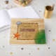 El papel de pergamino viejo con la hoja de palma, la piedra y las estrellas de mar en la playa enarenan el fondo.